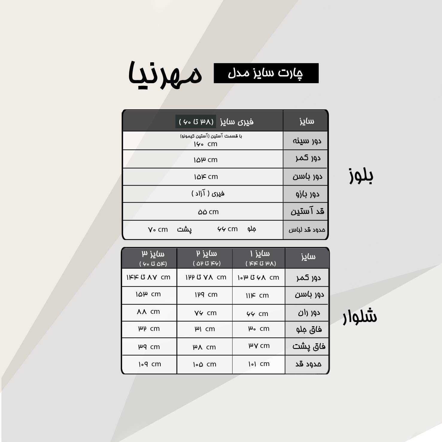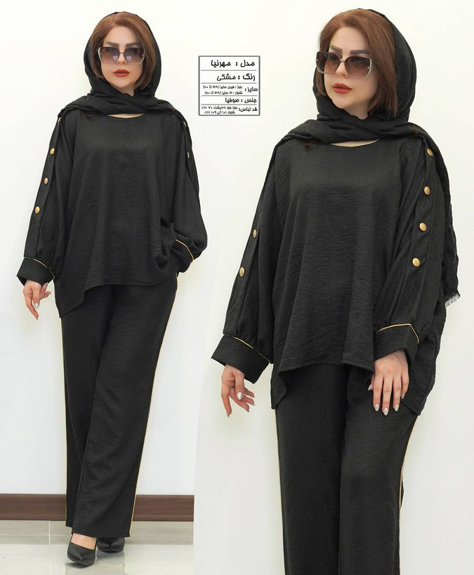 بلوز حدود قد : جلو 66 پشت 70 شلوار حدود قد : 101 الی 109