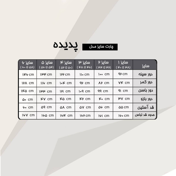 سایز ها : سایز 1 (38 تا 40), سایز 2 (42 تا 44), سایز 4 (50 تا 52), سایز 5 (54 تا 56), سایز 6 (58 تا 60)