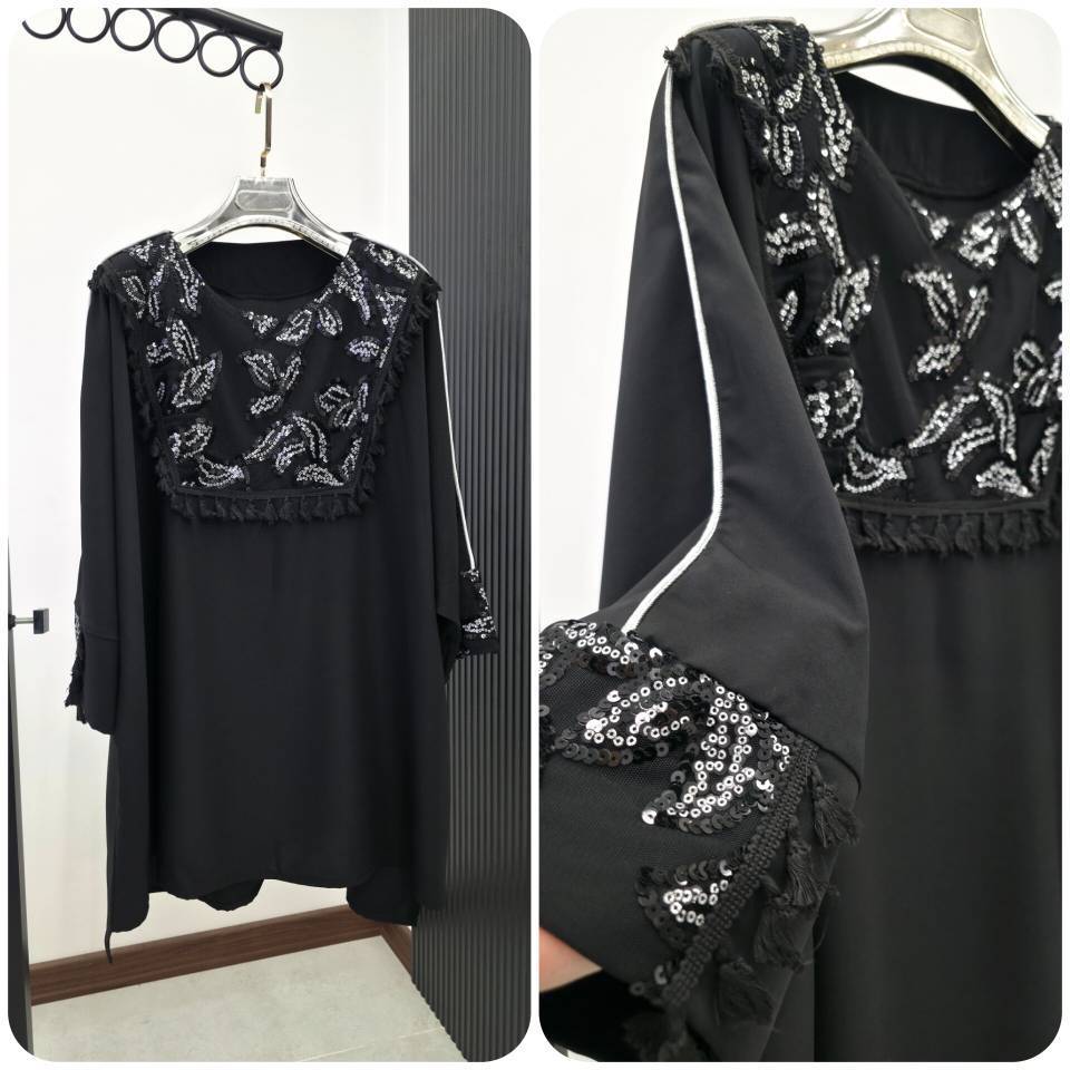 نام : #خزان جنس : کرپ الیزه رنگ بندی : مشکی سایز ها : فیری سایز 38 تا 60 حدود قد : جلو 77 پشت 82 خرجکار : پارچه پولک دوزی . نوار منگوله و مغزی