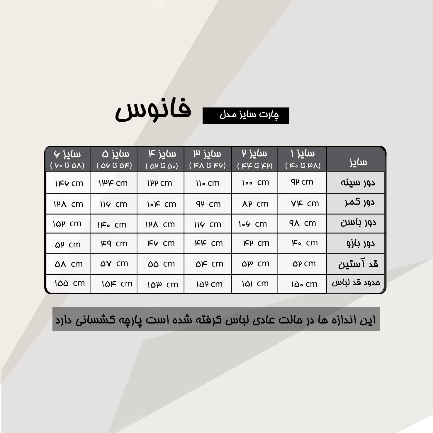 سایز ها : سایز 1 (38 تا 40), سایز 2 (42 تا 44), سایز 3 (46 تا 48), سایز 4 (50 تا 52), سایز 5 (54 تا 56), سایز 6 (58 تا 60)