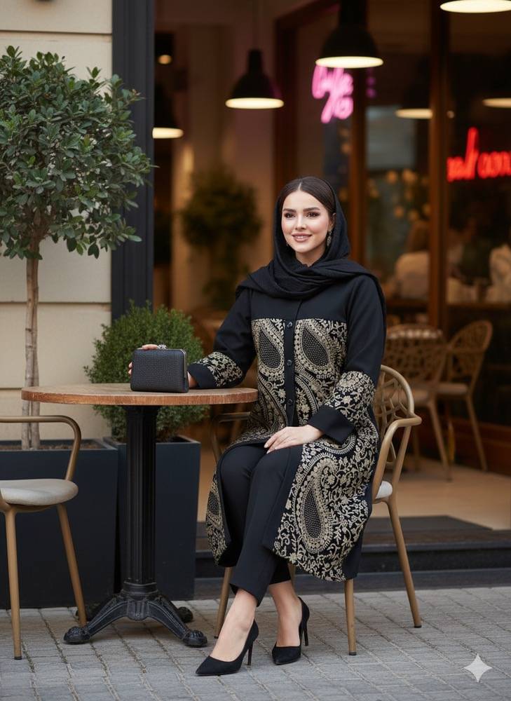 🔶 جزییات: تلفیق سنت و مدرنیته طرح اسلیمی با گلدوزی های متراکم طلایی رنگ روی زمینه مشکی (تنخور عالی 🅰️ -تضمین کیفیت دوخت مزونی 🅰️)